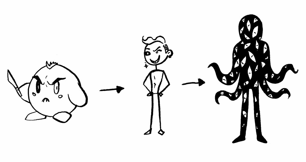It looks like Kirby but with angry eyebrows. It’s holding a knife. There’s an arrow pointing outwards at a stick figure Alkahest – toothy grin, a wiggle of hair and he’s… winking? She isn’t sure why she had him winking. Then another arrow leading to a big, shadowy silhouette, covered in eyes, with four long, tentacular arms.