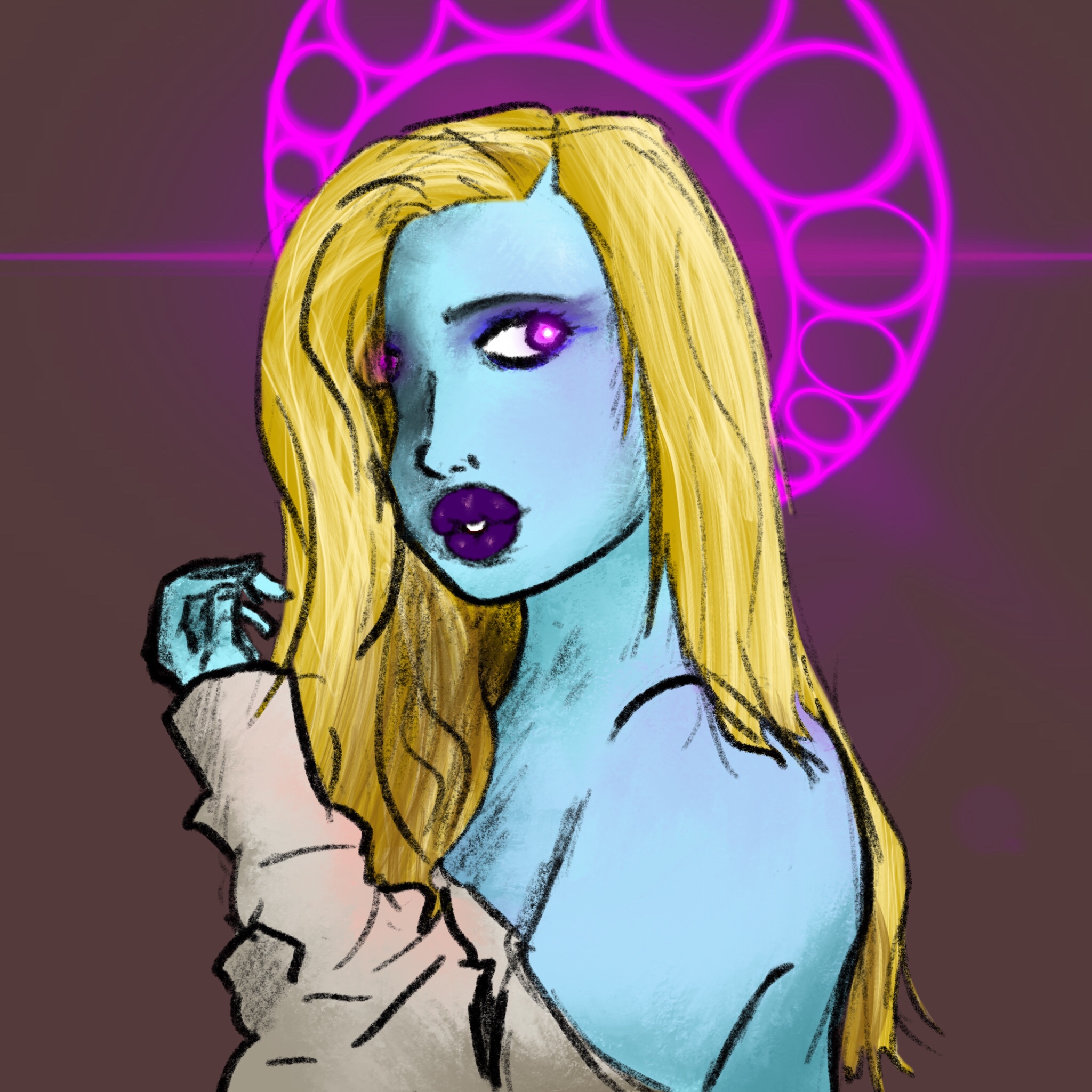 Chiasme, blue-skinned and beautiful. Her facility is Neutral Grounds, a café for Outsiders.